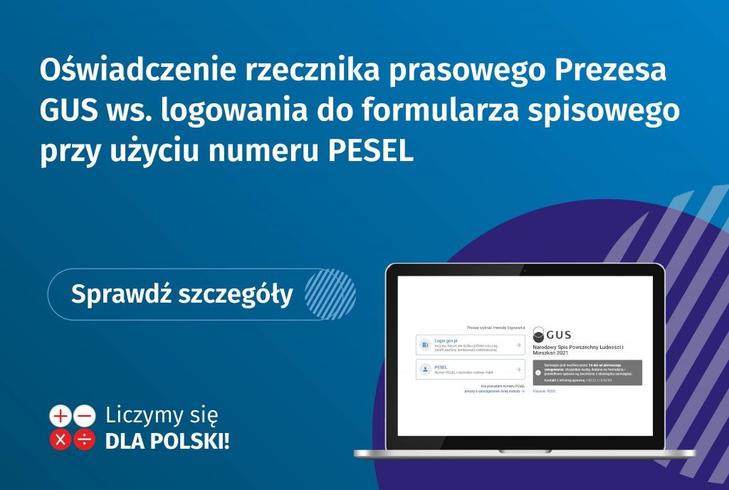 Oświadczenie rzecznika prasowego Prezesa Głównego Urzędu Statystycznego ws. logowania do formularza spisowego przy użyciu numeru PESEL A A A 06.04.2021 Oświadczenie rzecznika prasowego Prezesa Głównego Urzędu Statystycznego ws. logowania do formularza spisowego przy użyciu numeru PESEL