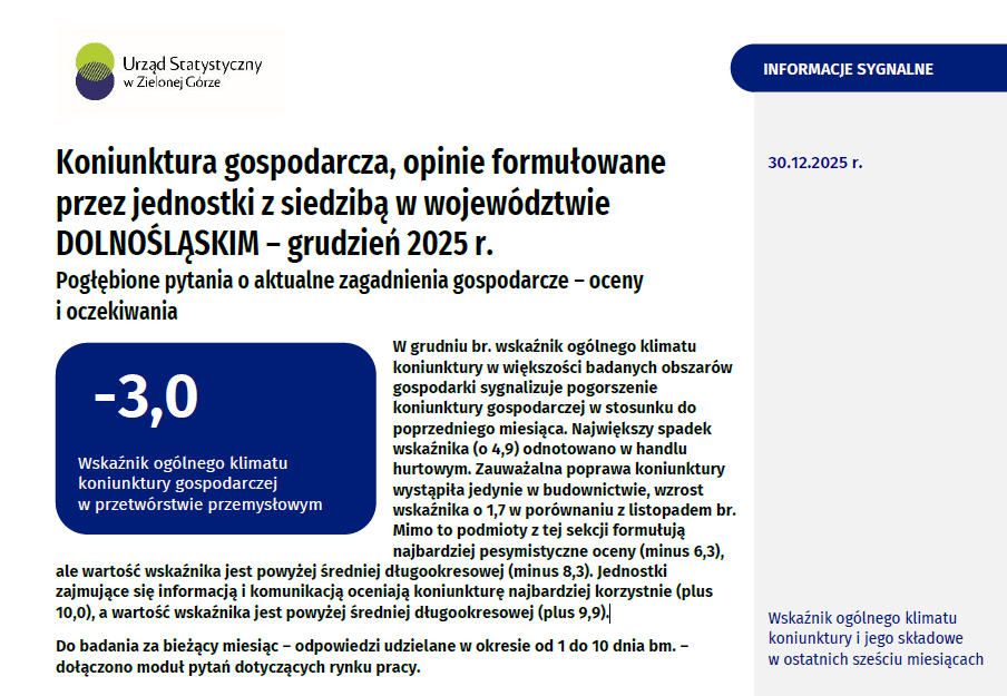 W grudniu br. wskaźnik ogólnego klimatu koniunktury w większości badanych obszarów gospodarki sygnalizuje pogorszenie koniunktury gospodarczej w stosunku do poprzedniego miesiąca. Największy spadek wskaźnika (o 4,9) odnotowano w handlu hurtowym. Zauważalna poprawa koniunktury wystąpiła jedynie w budownictwie, wzrost wskaźnika o 1,7 w porównaniu z listopadem br. Mimo to podmioty z tej sekcji formułują najbardziej pesymistyczne oceny (minus 6,3), ale wartość wskaźnika jest powyżej średniej długookresowej (minus 8,3). Jednostki zajmujące się informacją i komunikacją oceniają koniunkturę najbardziej korzystnie (plus 10,0), a wartość wskaźnika jest powyżej średniej długookresowej (plus 9,9).